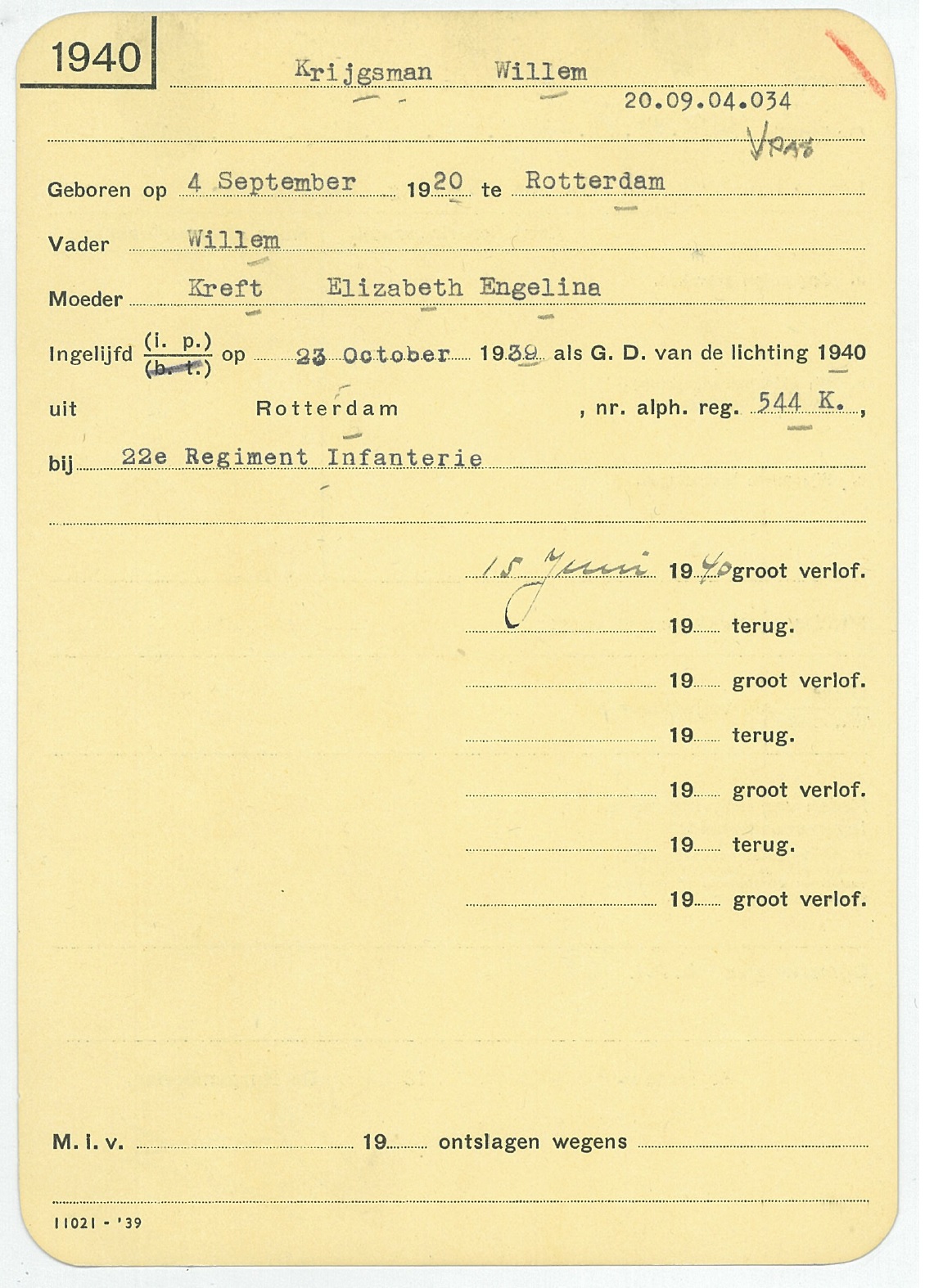 Hij heeft in 1939 zijn opleiding gehad in de Morspoort kazerne in Leiden. Mijn tante vertelde mij dat hij op de Grebbe heeft gezeten.