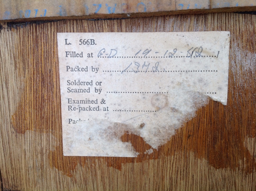 Ik ga er vanuit dat deze kist naoorlogs is, ongeveer jaren 50. Volgens mij staat er op het label in de kist, bij 'Filled at', ook een datum geschreven. Zo te zien 19-12-52.