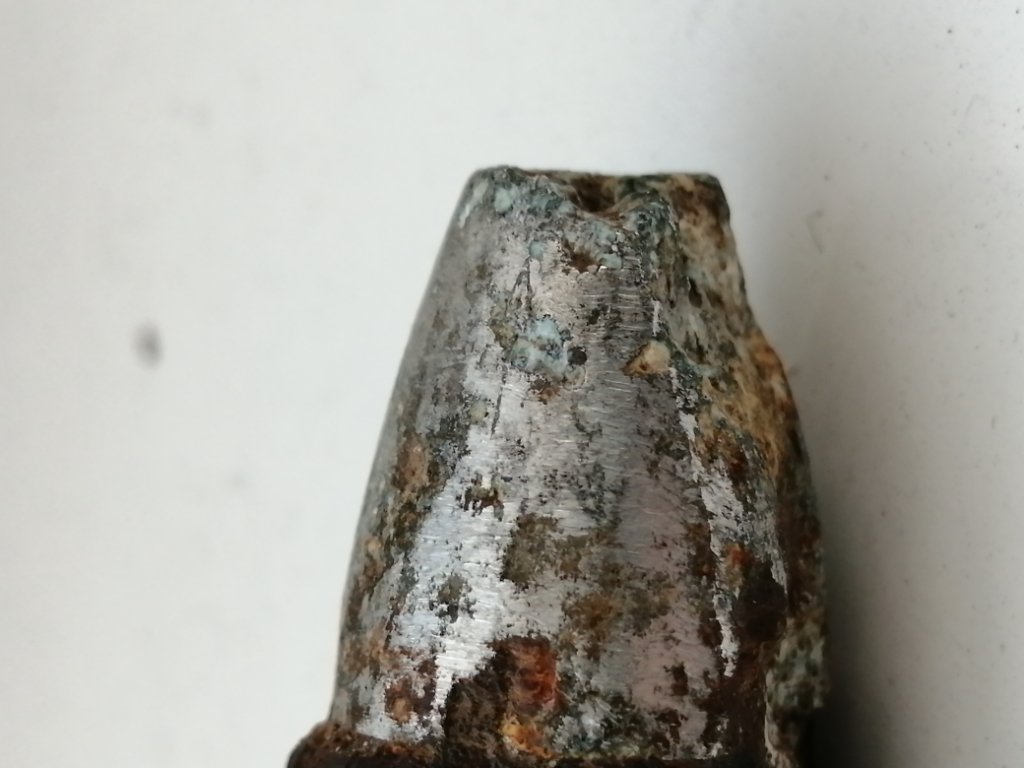 Je kan aan de koperen ring zien dat hij niet afgeschoten is (afgeschoten projectielen hebben er lijnen in lopen; de trekken/velden van de binnenkant van de loop).