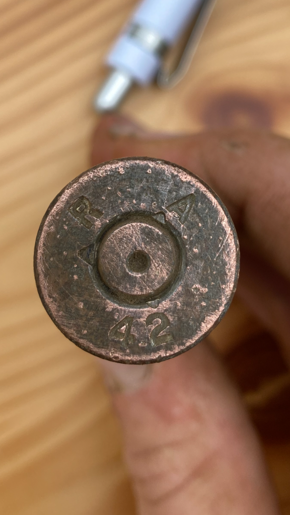 Ik heb in een weiland een huls gevonden waarvan ik graag zou weten wat het precies is. Het gaat om een koperen huls met op de onderkant 42 een A en een R. De diameter van de huls is 20mm
