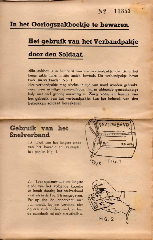 Gebruiks aanwijzing van het verbandpakje met 2 verbandpakjes. Had ik nog nooit eerder gezien.