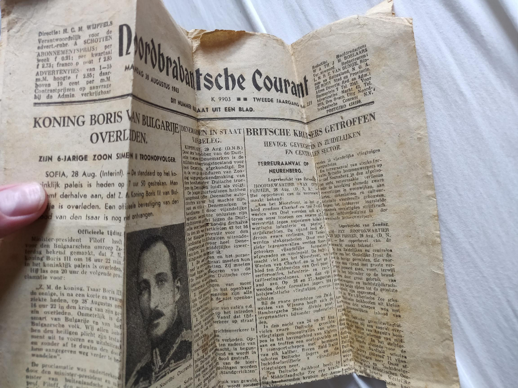 Heb afgelopen week de zolder opgeruimd en daar kwam ik nog een krant tegen uit 1943 en nog wat spullen uit die periode. Alleen de krant is opgevouwen en heeft tussen wat boeken gelegen of iets (goed plat dus). Wat ik in de opgevouwen toestand kan lezen is dat er wat berichten over het oostfront op staan. Eigenlijk wil ik deze krant openvouwen en inlijsten of iets dergelijks. Gewoon zodat je er nog iets aan hebt.