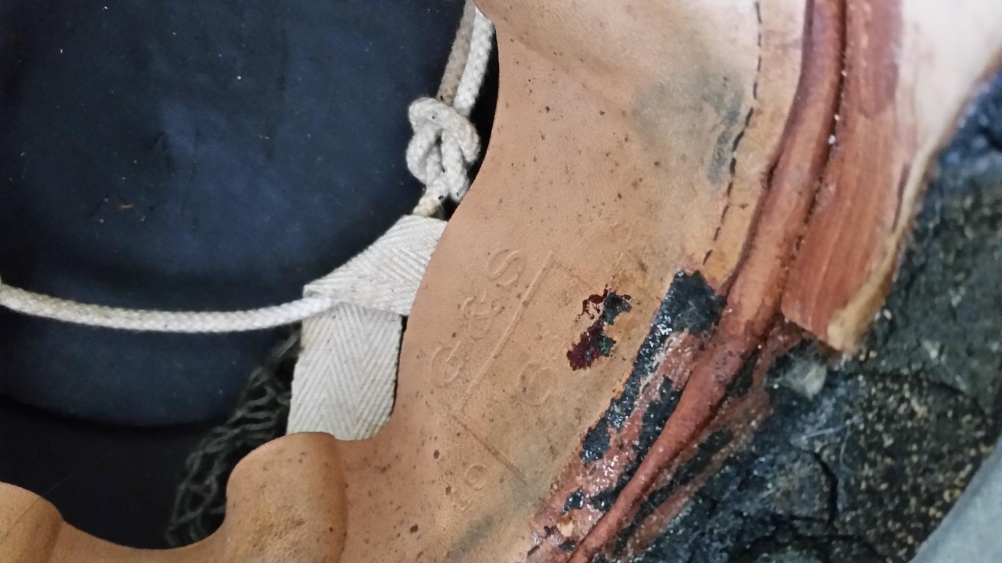 Dat G&S helmen er nieuw uitzien komt omdat ze voornamelijk niet gebruikt zijn. Meestal in opslag. Dit deed men door de helmen opelkaar te stapelen. Het Leer wat in contact komt met de metalen helm eronder verkleurd meestal donkerder.