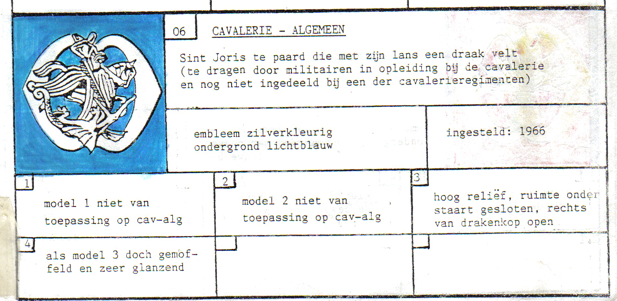 Ik heb de omschrijving 'nassaus blauw' uit latere beschrijvingen. Of de kleur inderdaad in de loop der jaren wat is bijgesteld weet ik niet; ik verzamel ze niet maar ben werkzaam bij het bedrijf wat deze emblemen voert. Volgens mij waren er op een gegeven moment vier cavalerieregimenten in bedrijf en vijf verschillende achtergrondjes (ondergrondjes volgens de brochure)