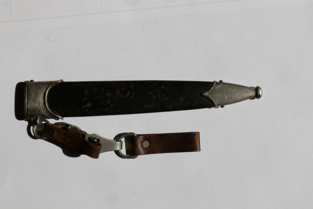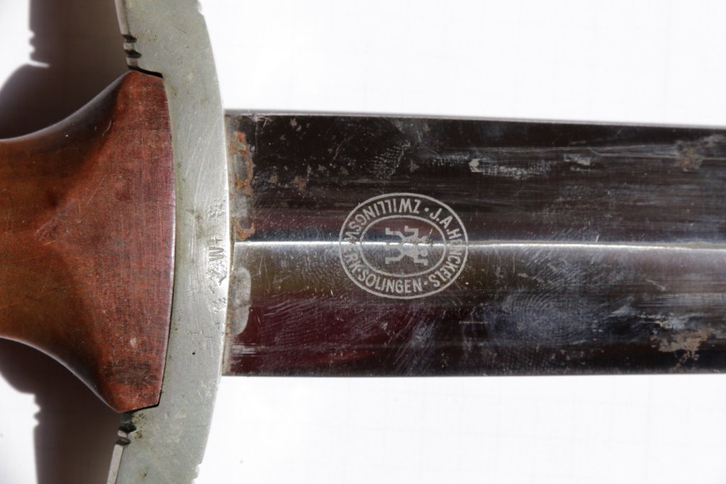 Het is inderdaad een NSKK dolk, uiterlijk vrijwel hetzelfde als de SA dolk. Alleen de schede is zwart gelakt of gecoat. Het is een vroege dolk, te herkennen aan het geëtste logo van de Firma Henckels (ze zijn nog steeds in de messen business actief). SA, SS, NSKK en HJ dolken zijn te verdelen in vroeg, transitioneel of laat. Transitioneel heeft zowel een fabriekslogo als het RZM keurmerk met id nummer van de fabrikant. Late dolken alleen nog een RZM merken. WF op de stootplaat staat voor SA/NSKK Stormsectie West-Falen.