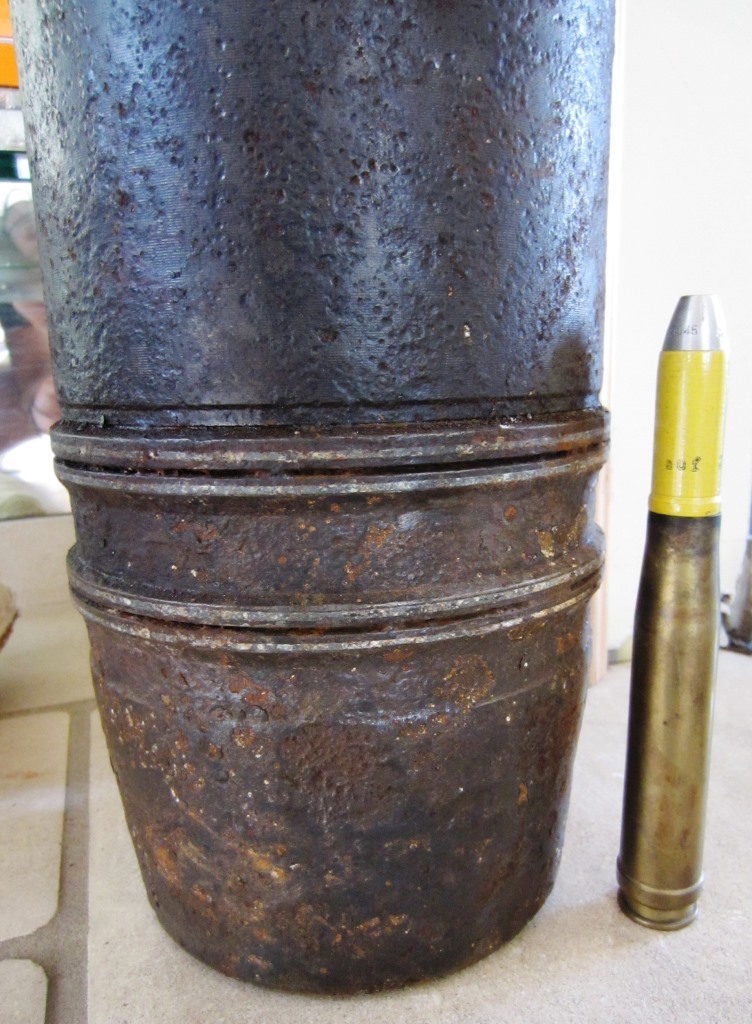 De granaten komen allemaal van een Duits oefenterrein, waar springstoffen getest werden, de oefengranaten werden gebruikt om de springstoffen onder realistische omstandigheden te kunnen testen. Na de oorlog werd het oefenterrein opgeblazen en kwamen de granaten zo een beetje overal in de rondte terecht. De persoon waar ik de granaten aan kocht, had ze jàààààren geleden kosteloos mogen opruimen, maar hij had wel alle granaten mogen houden. Ze zijn dus allemaal voorzien van een laagje roest, dat met een staalborstel gemakkelijk verwijderd kan worden. Daarna wat olie er op en nu staat nummer 1 al in de living ... was even sleuren met dat ding :full: , maar hij staat er nu toch maar mooi te blinken!! Van zodra de rest wat opgekuist is, post ik er ook foto's van.