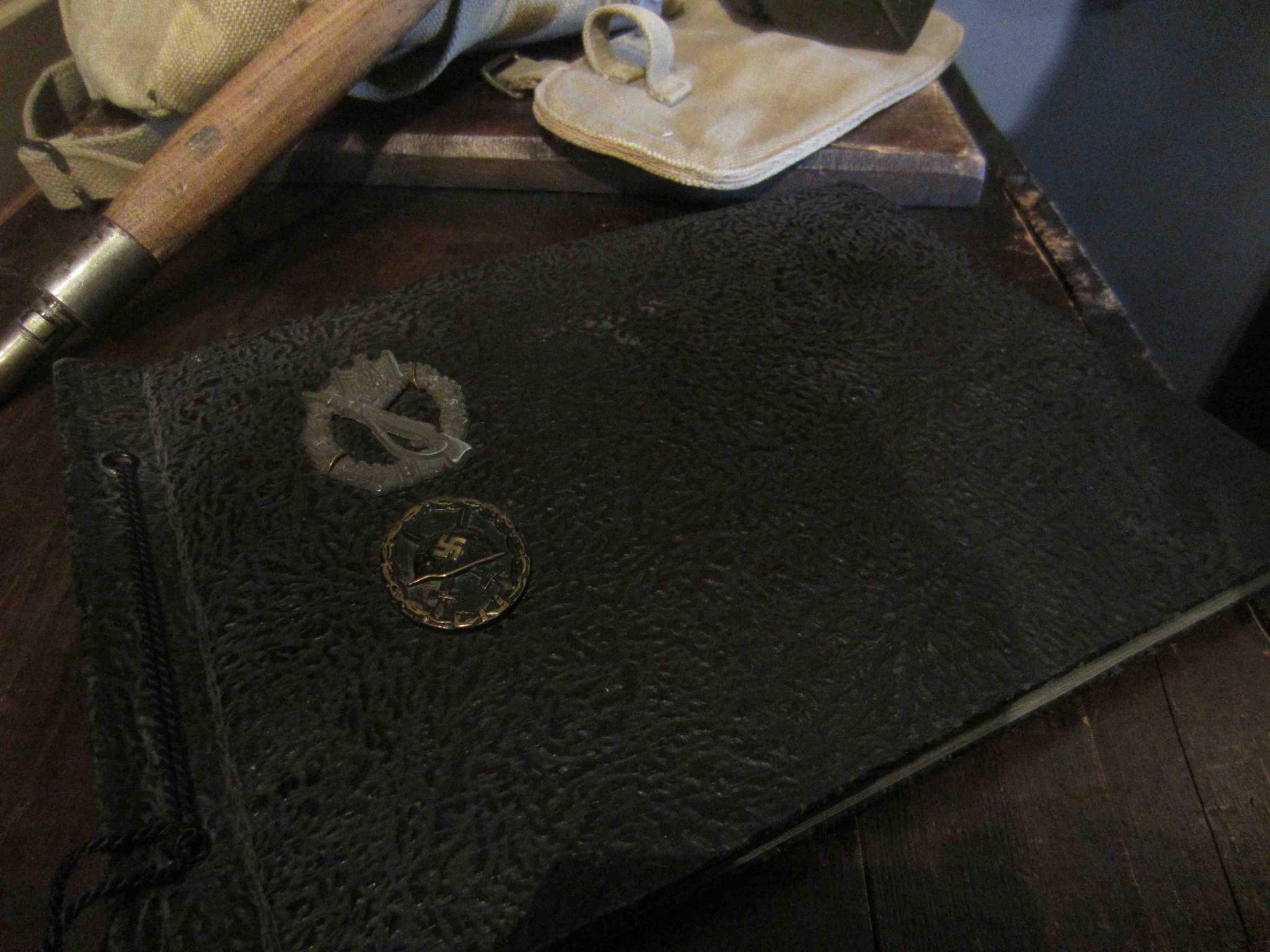 Eerst en vooral een heer sport adelaar. Deze zat normaal gezien op een sport blouse van de Heer. Als tweede is er een mooi fotoalbum bijgekomen, met op de kaft een VWA in zwart en een ISA. In het album zijn veel mooie foto's terug te vinden van volledig bepakte Duitsers. Ondermeer met A frame en al zijn toebehoren. dat zie je ondermeer op de volgende foto.
