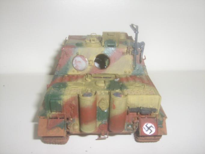 Het model is met de hand geverfd gebruik makend van revell-kleuren. Het patroon is inderdaad niet geheel geïmproviseerd, maar gebaseerd op het patroon van de king tigers uit sPzAbt 506 in de ardennen. Ik heb hierbij een aantal kleuren veranderd om de tank donkerder te maken, en omdat mengen mij niet erg goed afgaat (ben nog een vrij beginnende modelbouwer), meestal word voor dit patroon Matt 16 Sand, Matt 48 SeeGrün en Matt 37 Ziegelrot (kan ook 36 zijn) voorgeschreven. Omdat ik deze kleuren erg fel vind heb ik de zand vervangen door een okerkleur (matt (86? groen door matt 40 en rood door Lederbraun (matt 86 (82) (allemaal revell-kleuren). Vervolgens heb ik de streepjes toegevoegd, een beetje gebaseerd op het originele patroon dat jij bedoeld met de puntjes (even de naam vergeten)