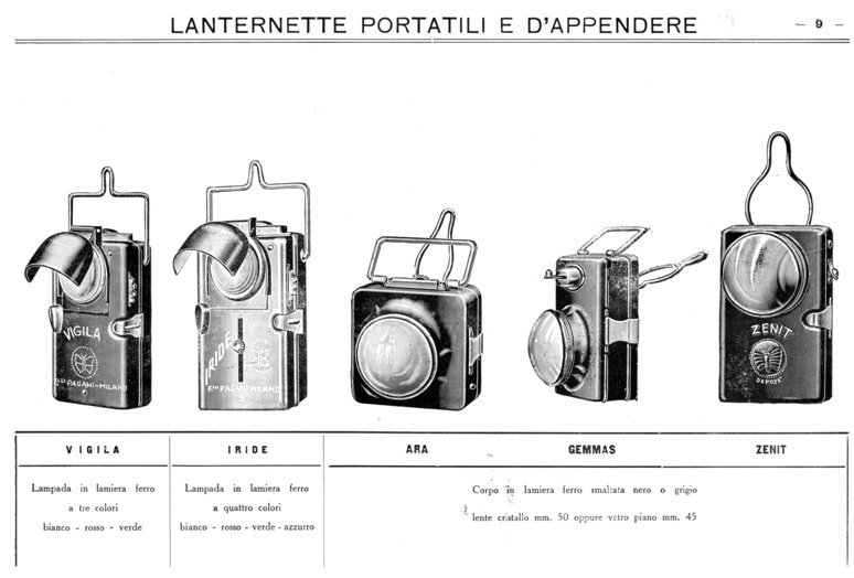 Zaklampen gebruikt in de militaire en Italiaans Spoorwegen Italiaanse - werden ook uitgevoerd in Duitsland - Fratelli Pagani heeft de productie van lampen na de oorlog studeerde voor het veld en civiel en militair in het buitenland uitgevoerde