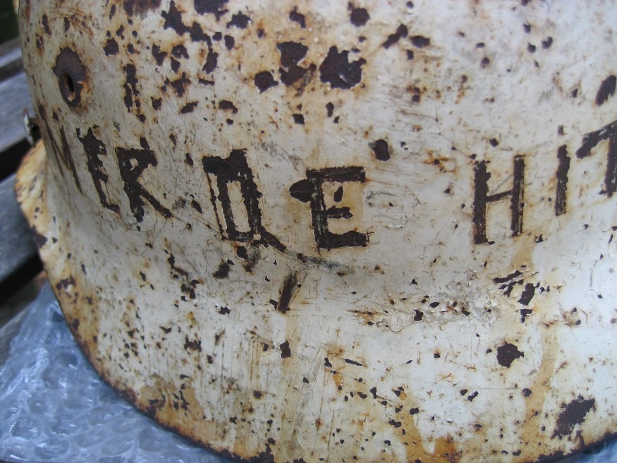 Er staat trouwens: mer de hitler of merde hitler en daarachter het swastika in de helm.