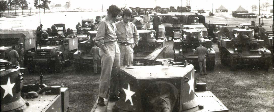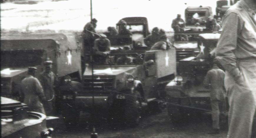 Twee originele WWII foto's met een aantal US Army medical officers die tanks inspecteren en halftracks. De linker foto laat een tank zien die de weg afrijdt, de rechter foto zie je 2 doctors op een tank staan (zie de Tanker helmets !) en in de achtergrond rijen van tanks, halftracks en trucks. De officieren waren doktors met de Massachusetts General Hospital in Boston en diende overzees in een medische capaciteit. De foto's zitten op een 'filmstrip':