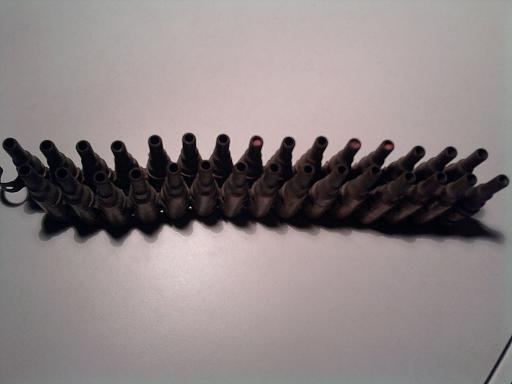Ik heb ook zo'n kogelband liggen met bijbehorende munitiekisten (let niet op de helmen). De rode verf is om de huls waterdicht te maken. Dit zijn losse flodders geweest (hulzen met kruit zonder kogels). Ze werden aan de bovenkant dichtgevouwen en een likje rode verf eroverheen zodat het waterdicht was. Losse flodders werden gebruikt ter oefening. Groeten