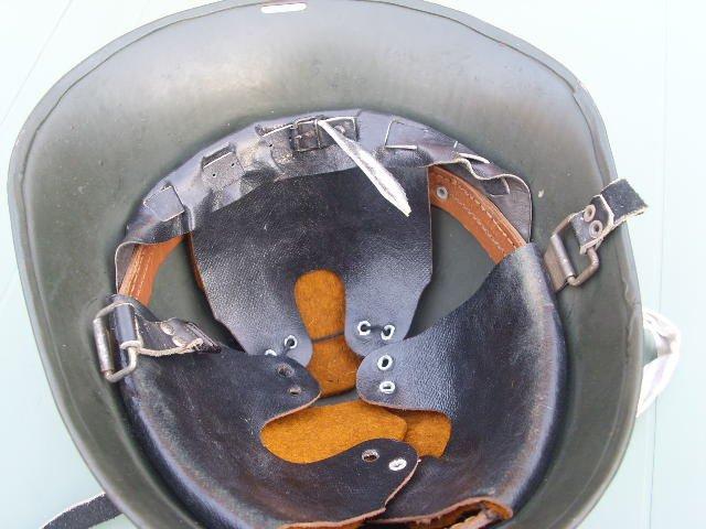 De helm is met zorg gespoten, zoals de "M38, Naar KNIL" voor politiegebruik. Er is geen enkel spoor van een vroegere bevestiging van een helmplaat te zien. Het binnenwerk lijkt me inderdaad ook na-oorlogs t.b.v. de Politie.