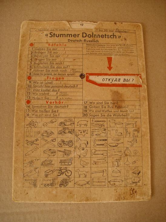 Een simpele vertaalschijf die onder de troepen aan het oostfront werd uitgedeeld. Deze werden ook veelvuldig door het Duitse kader gebruikt die ingedeeld waren bij de diverse Ostbataljons en Legioenen. De voertaal binnen deze eenheden was voor 90% russisch.