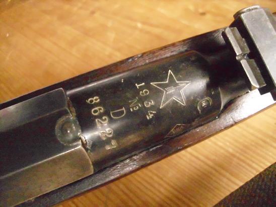 Produktiejaar 1934 (Tula - ster met pijl) met een vroege donkerhouten kolf. Op de kolf zijn nog restanten van verschillende stempelingen aanwezig.