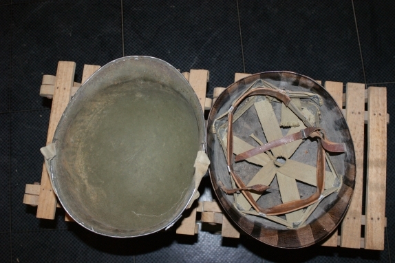 De helm is een M1 model met 'Fixed Bales". Dat is een redelijk vroegoorlogs model helm. De binnenhelm is ook vroegoorlogs, te zien aan het kleurloze ijzerwerk binnenin. De makerstempel van de binnenhelm (M1 model Liner) zit in het midden van de binnenzijde.Guibo schreef:Kan mij iemand helpen aan informatie over enerzijds de helm
