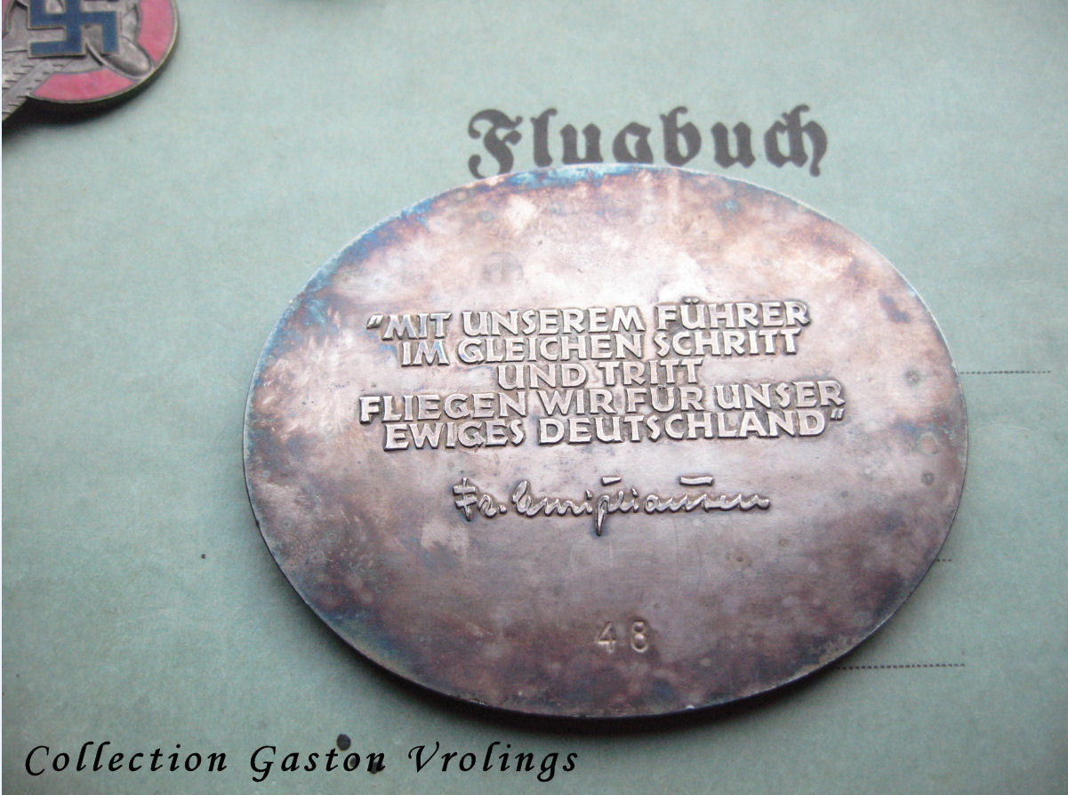De achterkant met de handtekening van NSFK Fuhrer en General der Flieger Friedrich Christiansen. Het nummer van de plakette is 48, veel meer zullen er ook niet gemaakt zijn.