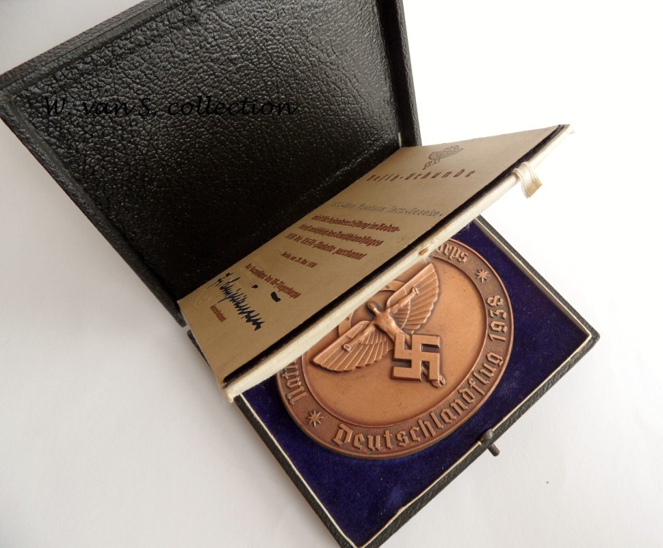 Deze foto''s zijn voor Wim. _/-\o_ Nadat ik zijn twee bronzen plakettes zag was ik verkocht en ging ook op zoek naar een fraai exemplaar in doosje. Typisch een geval van verzamelaars die onderling door het tonen van hun items de interesse voor mooie spulletjes aanwakkeren. Met wat geluk vond ik een tijdje geleden de groep met items van Heinz Haller en kon die overnemen. Hierbij zat oa de NSFK Plakette Deutschlandflug 1938 in zilver met oorkonde(!). Deze zilveren plakettes zijn uitgereikt aan de leden van de beste vluchtgroepen in de Deutschlandflug 1938. Ter illustratie: vergeleken met de bronzen plakettes zijn de zilveren plakettes letterlijk ongeveer 100 keer zo zeldzaam te vinden en bij veel mensen nog niet bekend...