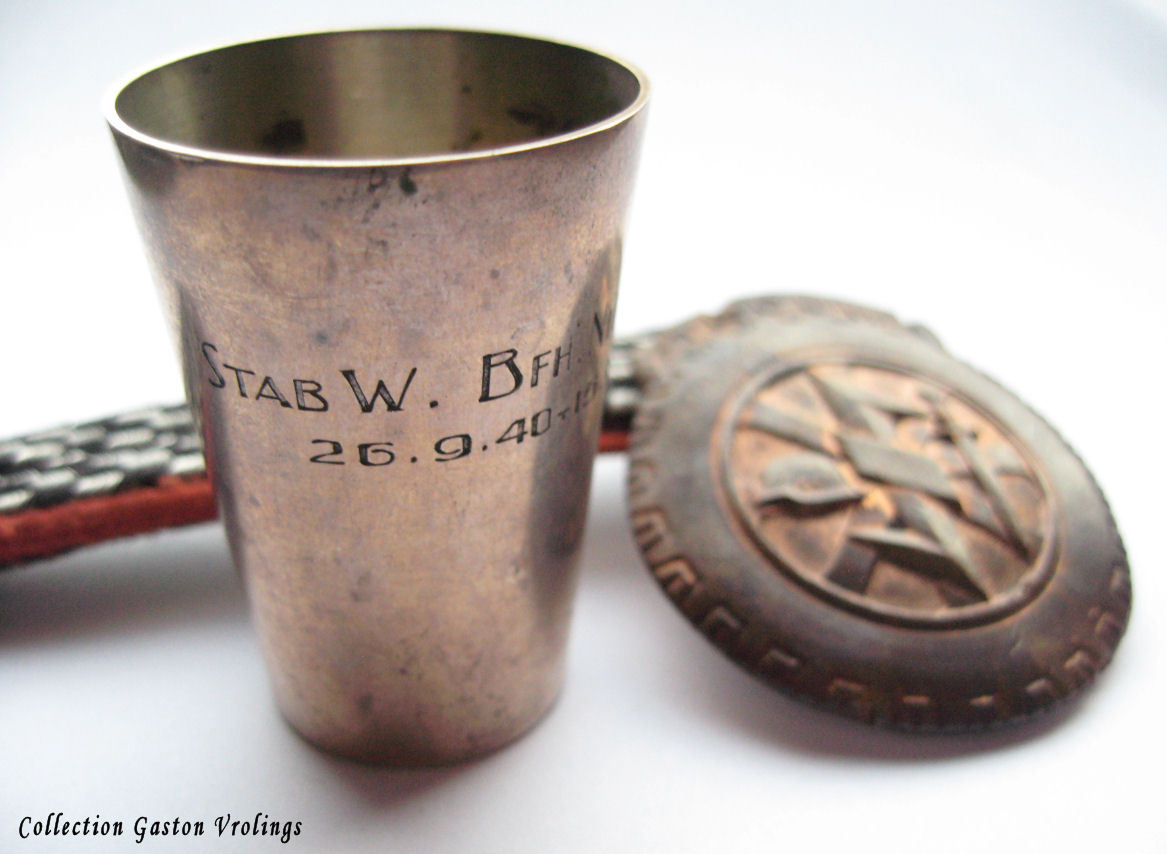 Nederlands NSKK Personal Ausweis en Löhnungs ausweis van Nederlandse NSKK-er De Jong uit Schiedam. Hij diende bij de NSKK Brigade Luftwaffe. De pas is compleet ingevuld en met pasfoto. Hiernaast ligt een NL NSKK schouderstuk, een bronzen NSKK onderscheiding (Trouw), en een zilveren herdenkingsbekertje (schnapsbecher) uit naam van de staff van de Wehrmachtbefehlshaber in die Niederlände (voormalig NSFK Führer Friedrich Christiansen). De items horen niet bij elkaar, alleen de pasjes zijn samenhorend.