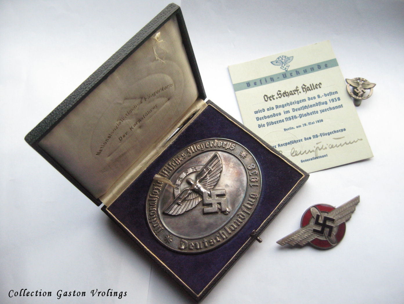 Deze foto''s zijn voor Wim. Nadat ik zijn twee bronzen plakettes zag was ik verkocht en ging ook op zoek naar een fraai exemplaar in doosje. Typisch een geval van verzamelaars die onderling door het tonen van hun items de interesse voor mooie spulletjes aanwakkeren. Met wat geluk vond ik een tijdje geleden de groep met items van Heinz Haller en kon die overnemen. Hierbij zat oa de NSFK Plakette Deutschlandflug 1938 in zilver met oorkonde(!). Deze zilveren plakettes zijn uitgereikt aan de leden van de beste vluchtgroepen in de Deutschlandflug 1938. Ter illustratie: vergeleken met de bronzen plakettes zijn de zilveren plakettes letterlijk ongeveer 100 keer zo zeldzaam te vinden en bij veel mensen nog niet bekend...