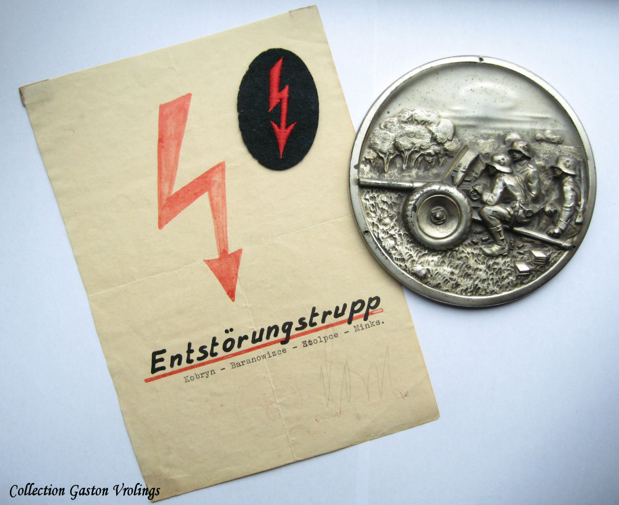 In ieder geval, voor vandaag niks moeilijks met fotos. Hier zijn een paar plaatjes die ik een tijdje terug nam van een Funker Artillerie embleem met bijbehorende (in het veld gemaakte) oorkonde. De stempel en handtekening op de oorkonde zijn bijna onleesbaar geworden, maar in werkelijkheid nog te ontcijferen. Gezien de rode kleur heb ik maar een artillerie plakette ernaast gelegd voor de foto: