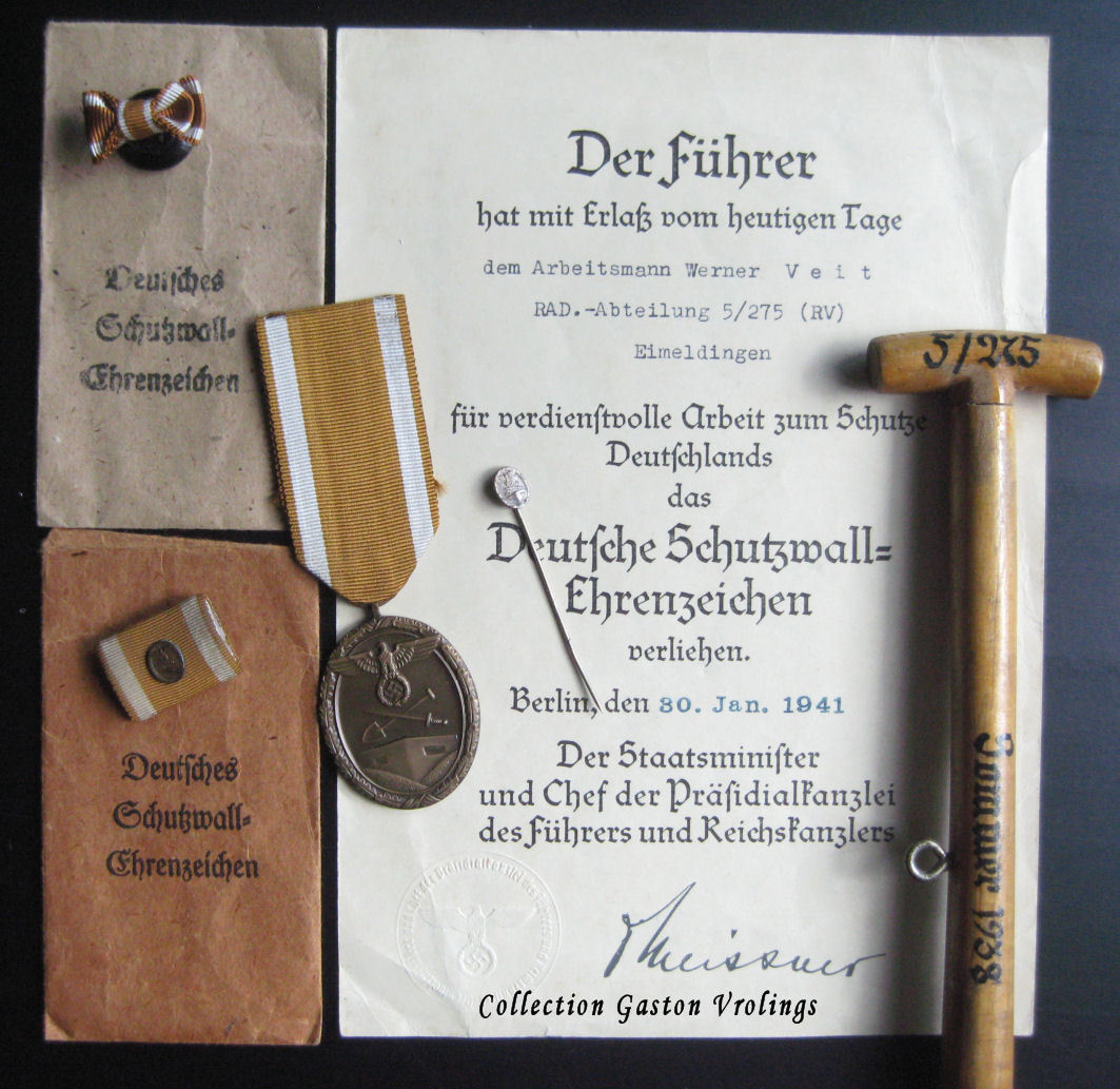 Op de foto staan: schutzwall medaille, 2 verschillende makerszakjes, baton met mini oplage, minispeldje aan lange naald, oorkonde en een mini schepje. Met name dit mini schepje is het ware pronkstuk. Het nummer erop correspondeert met het numme op de oorkonde: RAD afdeling 5/275 Het schepje is waarschijnlijk een geschenk geweest van een bedrijf dat voor de Schutzwall werkzaamheden verrichtte in 1938 en haar werknemers zo'n schepje gaf als dank voor verrichtte arbeid.