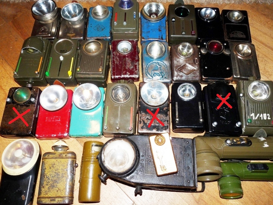 Photo3 ) There are 3 lights from the WWO 2 peiode 1938 -1944 with red cross marked made in Germany the most other lamps made in CZ - CCCP Russia - DDR - Germany ......1950-1960 -1970-1980.