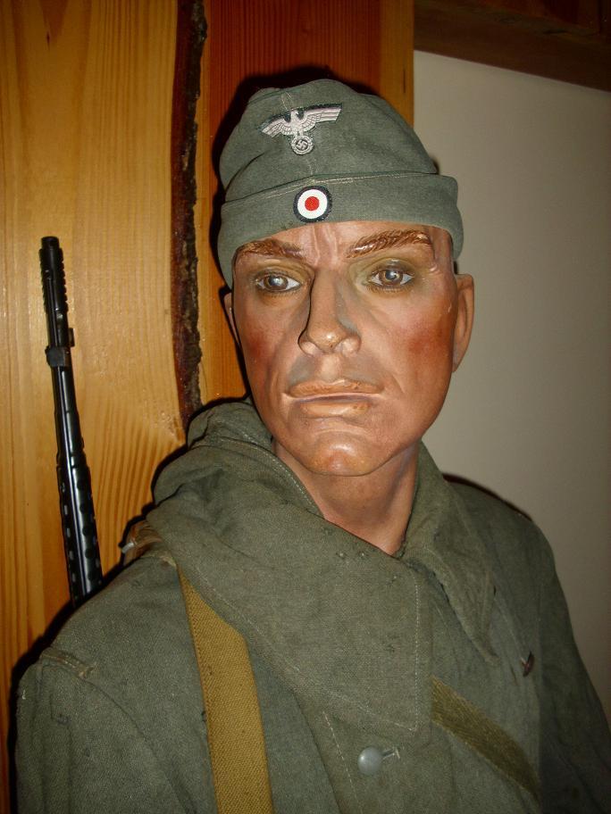 Het schild op de originele foto lijkt mij een overgeschilderde adelaar, je kan rechtsboven in de hoek als je hem uitvergroot nog een deel van het oorspronkelijke onderliggende plaatje zien. Bij mijn helm is het embleem geheel verdwenen, waarschijnlijk weggekrast, naar de toen geldende voorschriften mbt de Ost vrijwilligers.