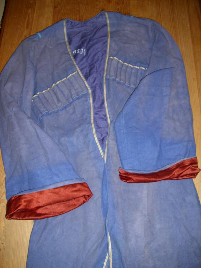 Leuk stuk - wie droeg dit, en wanneer? Lijkt me een weinig praktisch stuk voor in het veld (beetje WOI-Poilu-taferelen met dat blauw)? Beetje Kozakkenstijl?