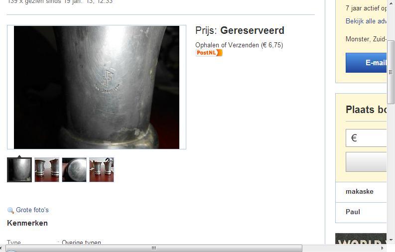 Deze vond ik erg grappig........ Advertentie 636323067 op MP. NSB Weerafdeling bekers. Natuurlijk 100% oirigineel. In zijn enthousiasme is hij echter vergeten dat Weerafdelingen in die tijd met een dubbele E geschreven werd. Weerafdeelingen dus. Ook lijkt de Wolfsangel er ingekrast te zijn.