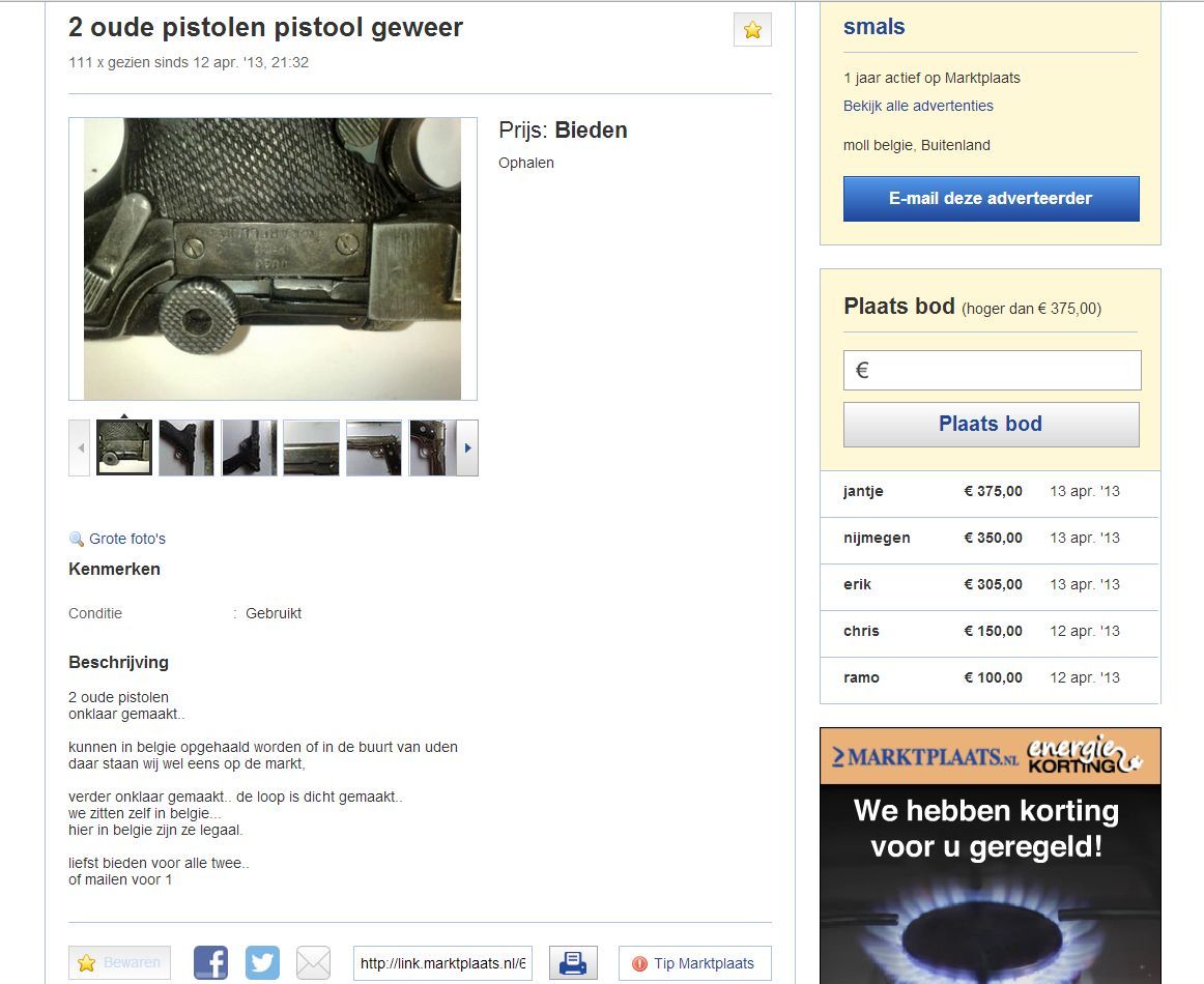 Hier deze is ook lachen 2 replica wapens luger P08 en de Colt.45acp uit aluminum vervaardigd als model zijnde maar wel in strijd met de regels WWM. Het vreemde aan deze advertentie is dat er hoog op geboden word,deze ALU modellen hebben totaal geen verzamelwaarde ,zullen deze bieders nu dan werkelijk denken dat zij een echt wapen kopen of zo.Het is tevens onvoorstelbaar dat dit op MP wordt toegestaan, heb deze advertentie al vele malen voorbij zien komen is dan plotsklaps weer verwijderd maar staat de volgende dag er weer dood leuk opnieuw geplaatst .....pfffff lekker professioneel bezig.