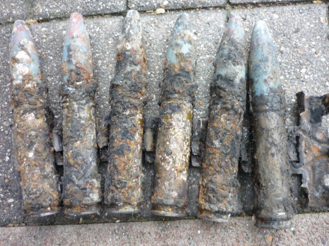 De patronen lijken me 30x97B voor het DEFA kanon. Aan de schakel te zien lijkt me deze de meest voor de hand liggend. Andere mogelijkheid is 30x113B voor het ADEN kanon. Zo te zien zitten de projectiel er nog origineel op de hulzen gekrompen. Je moet hoe dan ook uit gaan dat het nog geladen patronen betreft. De enige mogelijkheid is de politie of de opruimingsdienst waarschuwen om ze op te laten halen. Ga ervan uit dat de projectielen een lading kunnen hebben. In deze staat is niet te zeggen wat het projectiel exact is.