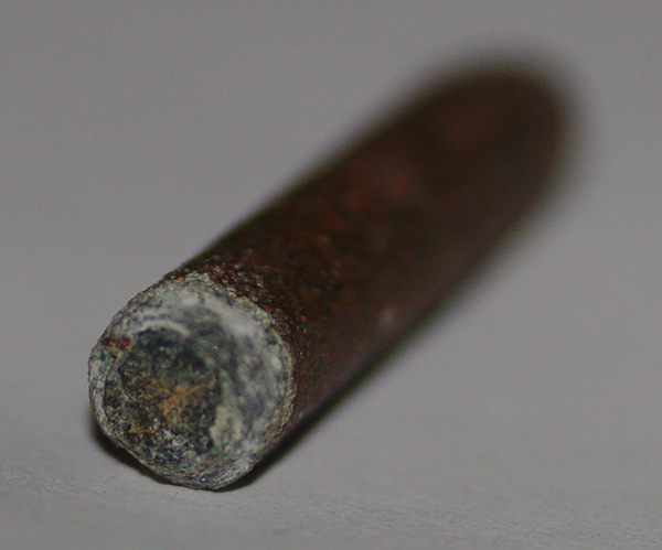 Dit lijkt op een kogel, is vrij zwaar (9 gram). Grootste gedeelte van het lichaam heeft resten van een koper/messing glans maar is aardig gecorrodeerd. Achterste gedeelte is loodgrijs.