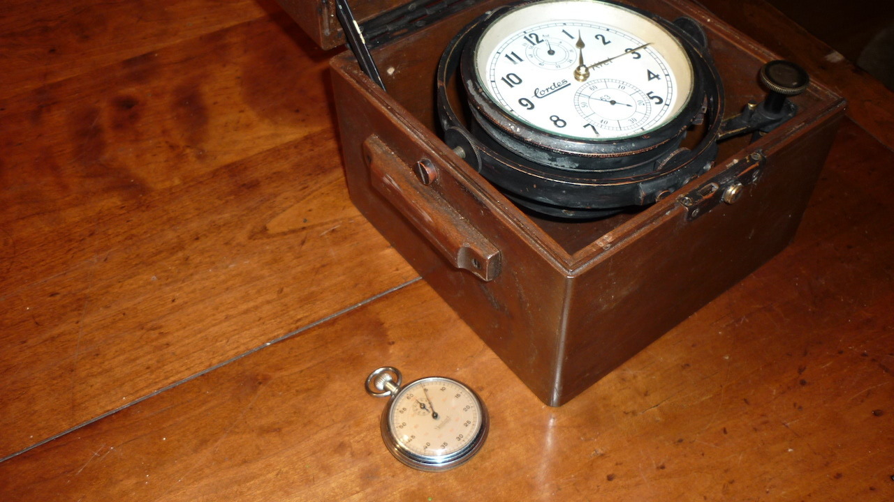 Hier nog twee aparte stukken de eerste foto's betreft een scheepschronograaf van Cordes uit 1944,het bestaat uit een uurwerk van zwart geschilderd messing opgehangen in een mahonie houten kist.