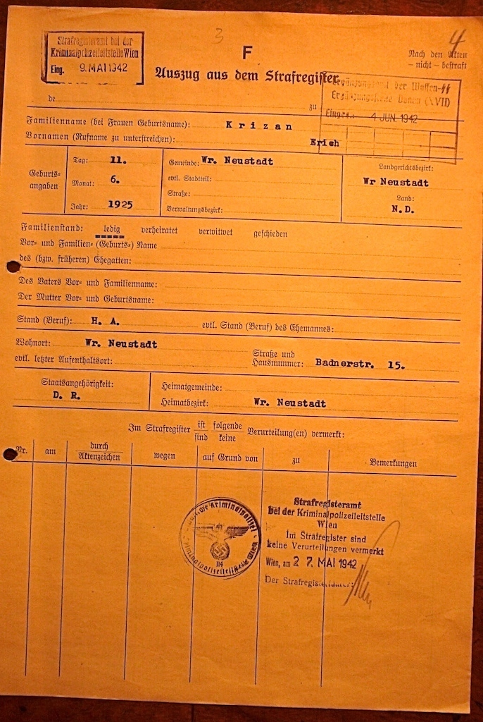 Het volgende document is een bewijs dat er in het strafregister van deze SS geen feiten gevonden zijn,het bewijs werd naar het opleidingsregiment in Praag verstuurd.