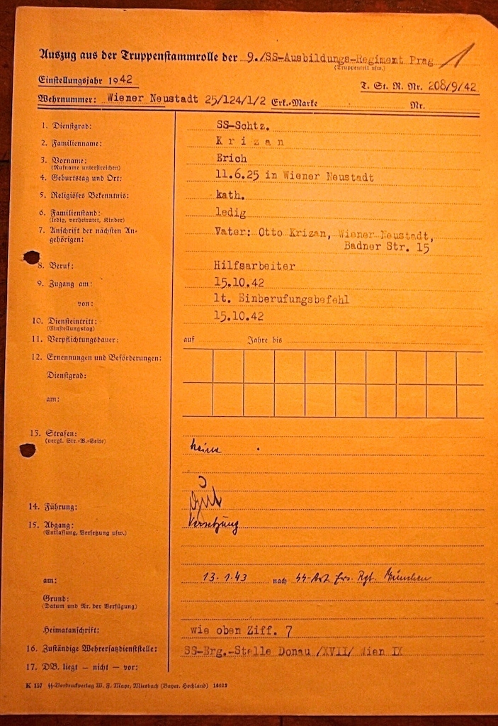 Auszug aus der Truppenstammrolle der 12./SS-Art.Erf.Rgt (12de SS Artillerie regiment),hij zat eerst in het SS-Ausb.Rgt.Prag (SS opleidingsregiment Praag)