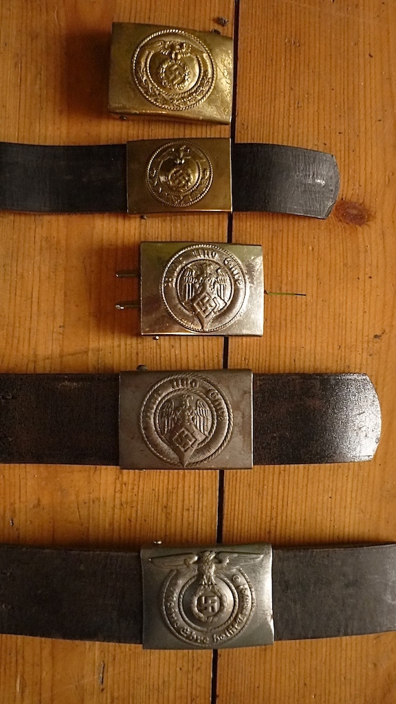 Op de eerste foto liggen bovenaan twee koppelsloten een van de Hitler Jungend (latere uitvoering) en een van de SA,daaronder een jongensriem van de Hitler Jungend,een vroege uitvoering,de afbeelding op het koppelslot daarvan was bijna gelijk aan die van de SA.
