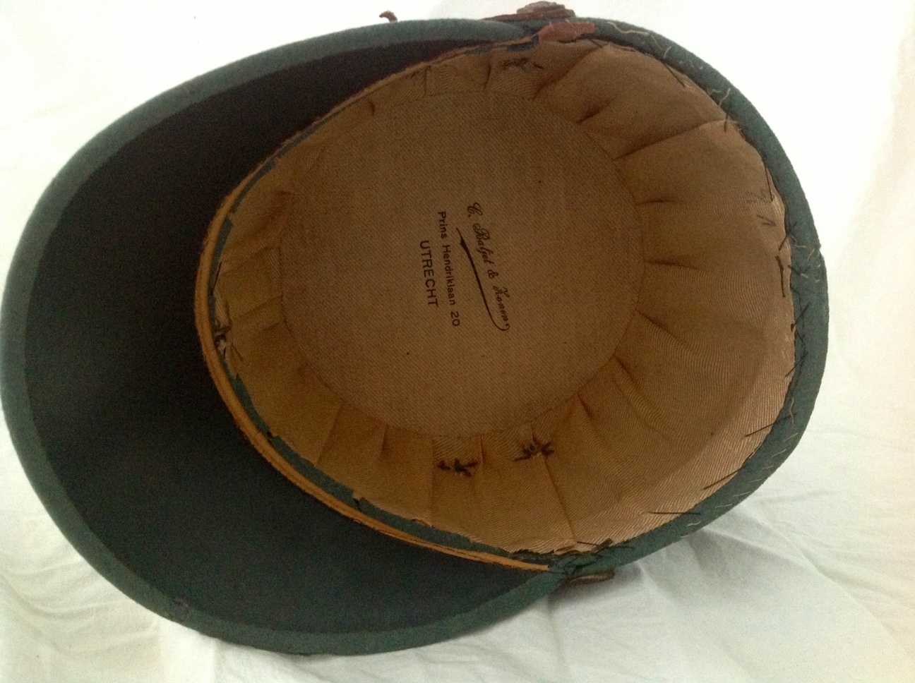 Hierboven zie je een Nederlandse kepie Model 1928 van een manschap Infanterie. Om exact te zijn betreft het hier een manschap Infanterie van het 3e Regiment Infanterie (R.I.). De metalen kokarde duidt aan dat het om een manschap gaat. De blauwe biezen duiden aan dat het een kepie van de Infanterie betreft. Aan de binnenzijde van de kepie staat de makerstempel van het hoofddeksel. Een makelij uit Utrecht.