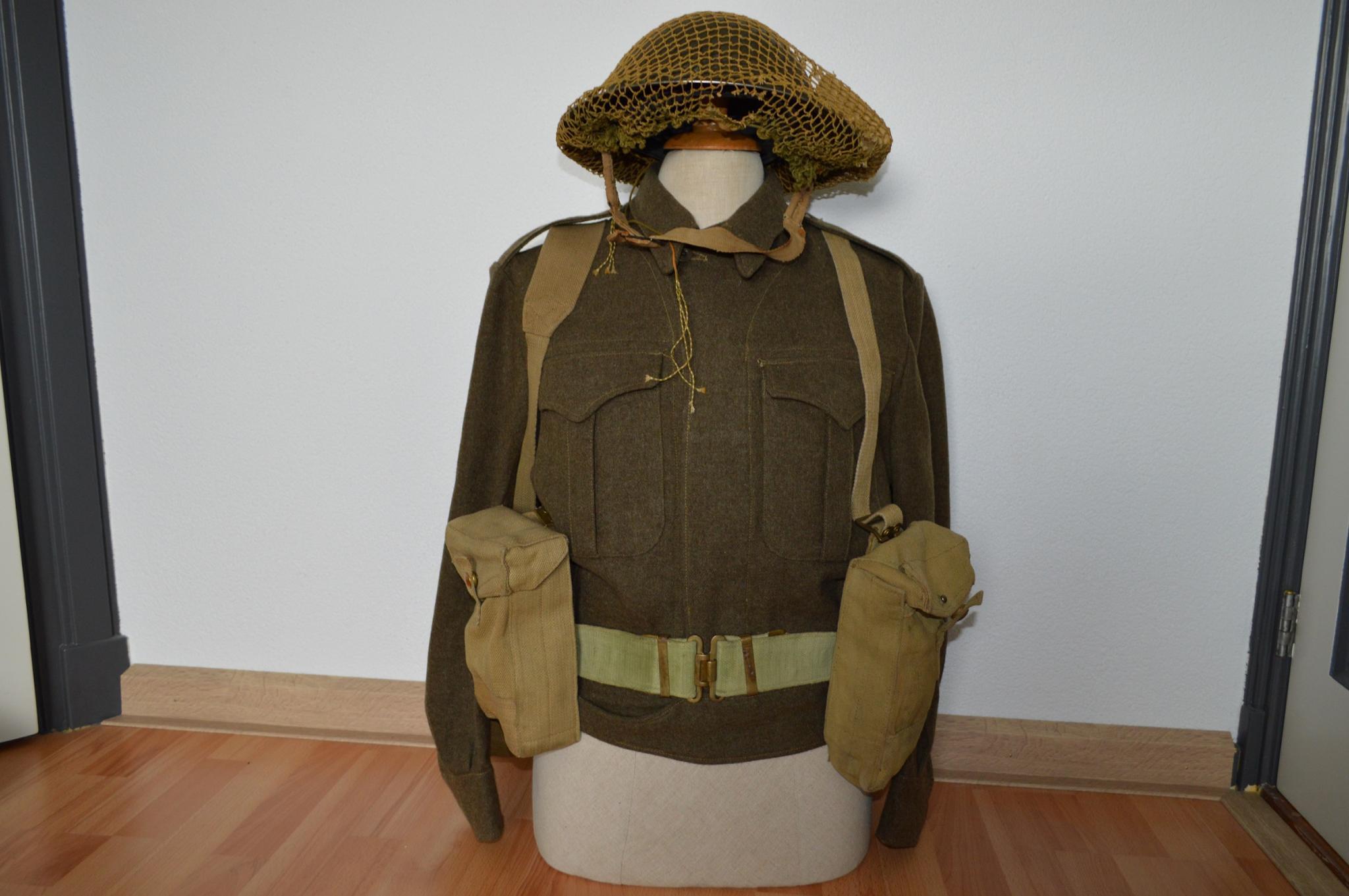 Hier is mijn Canadese buste. Hij is aangekleed met een Canadese helm en battledress. De helm is uit 1941 en de Battledress uit 1945. De webbing is Brits, hij is nog niet af. Er komt sowieso nog een spijker bajonet en eventueel een E-tool op.