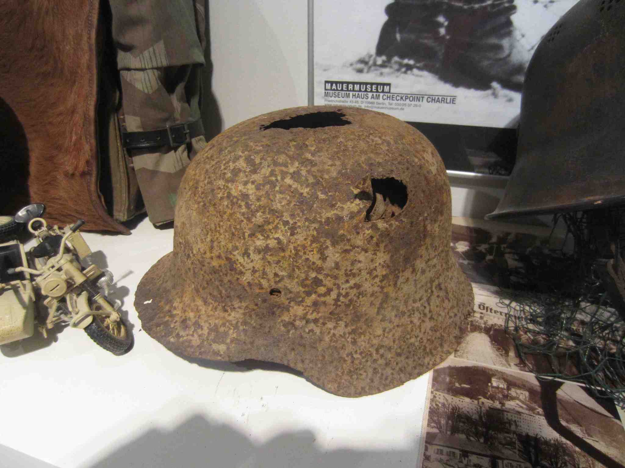 Dan is er ook nog een mooie Duitse M42 bodemvondst bijgekomen. Deze is van boven een beetje doorgeroest, maar displaywaardig. Hij heeft nog een groot deel van zijn binnenwerk en hij is getroffen geweest door een kogel. Je kan mooi zien waar de kogel de helm heeft doorboord, en waar hij er is uitgekomen.