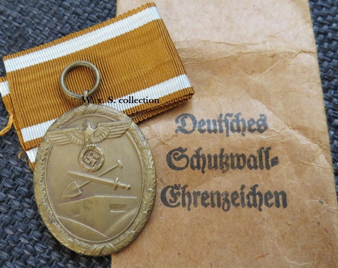 Schutzwall ehrenzeichen ofwel Westwall medaille met zakje (verleihungstüte). Zakjes gemarkeerd met Julius Maurer en E. Ferd. Wiedmann.