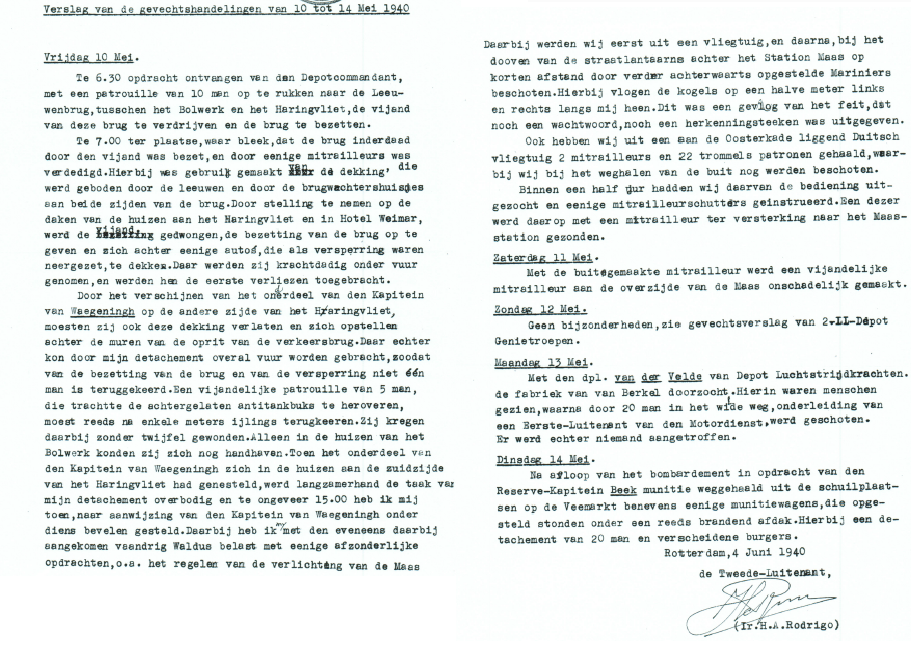 Naast enkele nieuwe boekjes en plaatjes de laatste tijd is dit toch wel de leukste; het oorlogszakboekje 2e Lt. H.A. Rodrigo van 2-II Depot Genietroepen. Daar nam hij deel aan de opleiding tot reserve officier. Luitenant Rodrigo nam echter de leiding over 10 man van 2-II Depot Genie bij de getrachte herovering van de vierleeuwenbrug in Rotterdam in mei 1940; hij beschoot oa met een buitgemaakte vliegtuigmitrailleur Duitsers bij de brug.