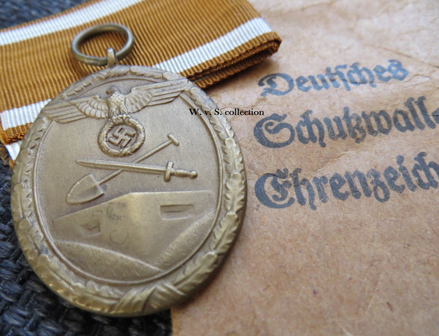 Schutzwall ehrenzeichen ofwel Westwall medaille met zakje (verleihungstüte). Zakjes gemarkeerd met Julius Maurer en E. Ferd. Wiedmann.