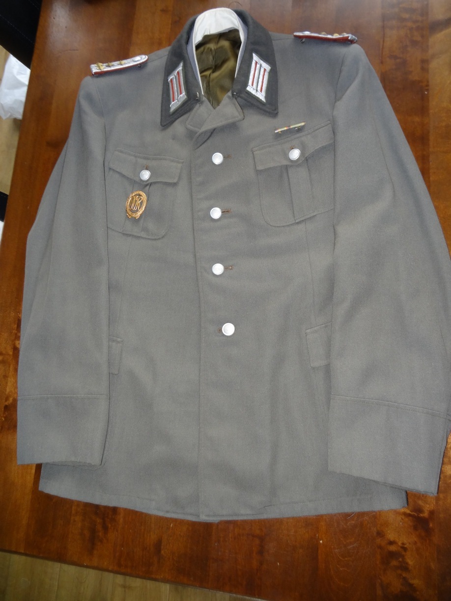 Naast een plastic paradehelm (en het boek "Uniforms of the Third Reich", niet op de foto) een ge-wel-dige set uit de vroegste periode van de NVA. Op maat gemaakte Stiefelhose, op maat gemaakt uniform voor de zomermaanden voor een hauptmann der Artillerie en, als klapper op de allergrootste vuurpijl, een "M43" voor een officier der artillerie uit de periode 1956-1961 (stempel is moeilijk leesbaar, maar waarschijnlijk 1956). Nog met "bullseye"-kokarde uit zwart-rood-goud en rode bies (wapenkleur voor artillerie). Na 1961 verdwenen zowel de SRG-kokarde, als de bies - in 1963 verdween de "M43"-stijl winterpet helemaal om vervangen te worden door de Russische-stijl Uschanka's.