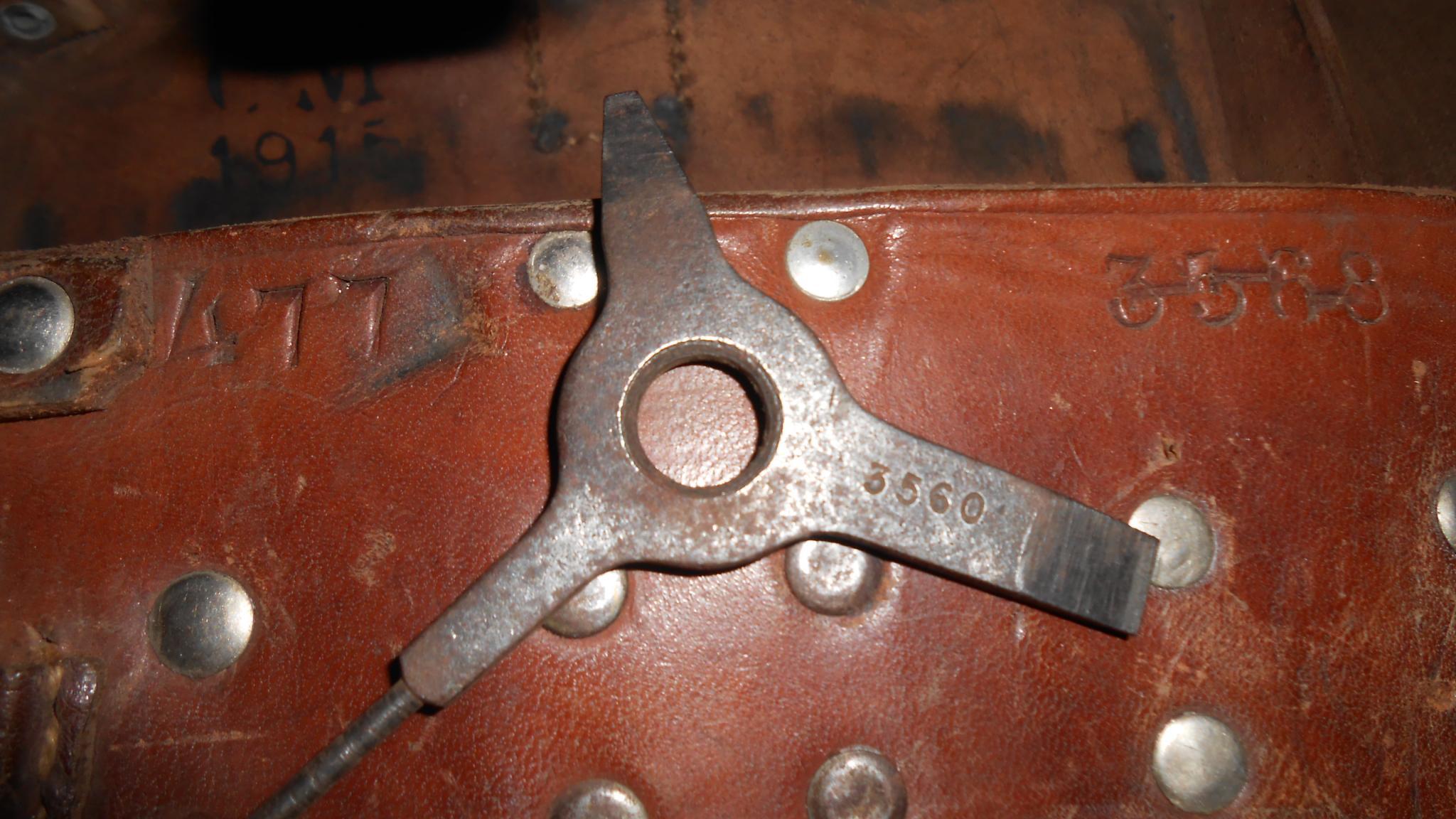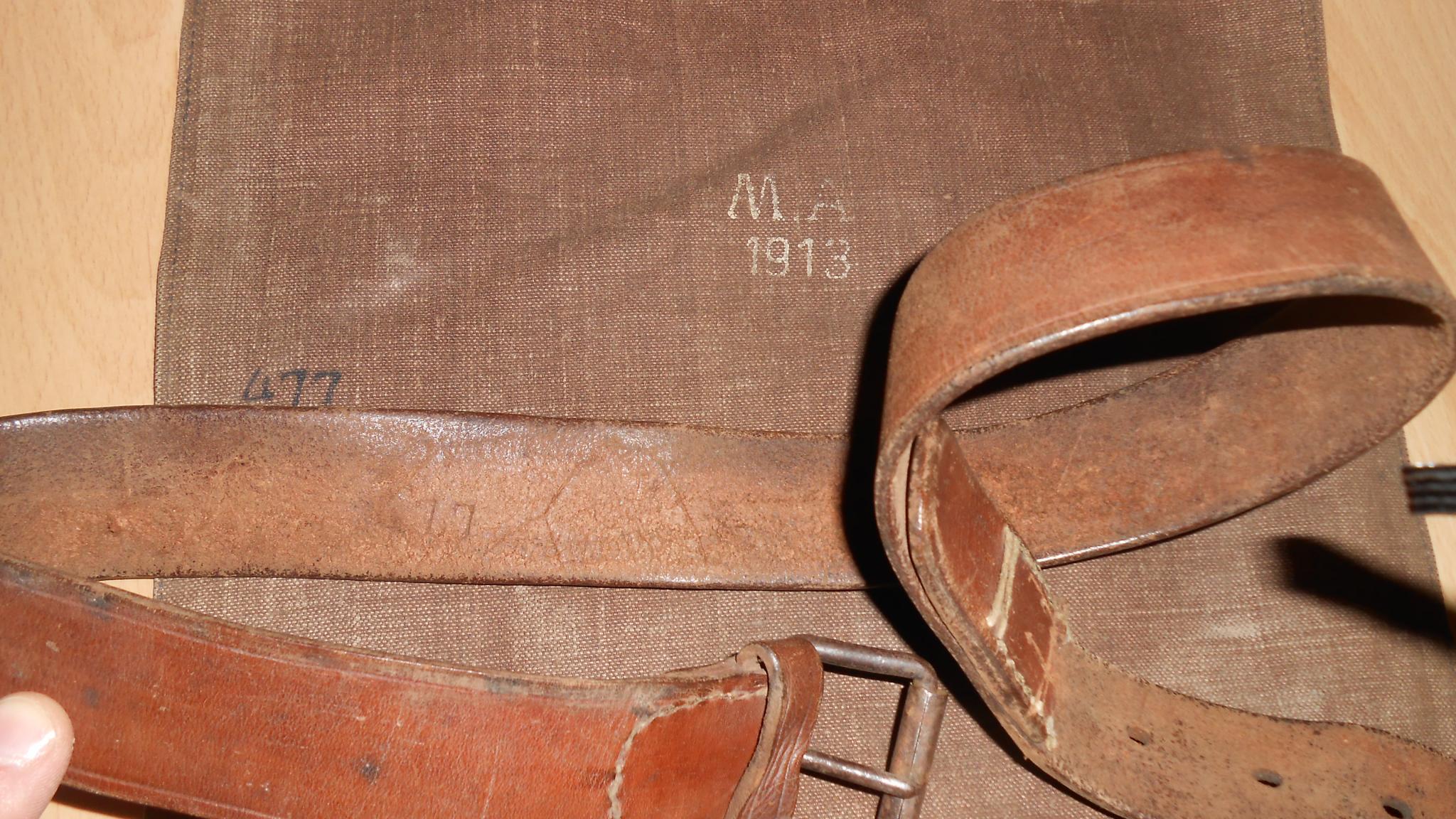 De bloktassen (links en rechts, CM1915) met sleuteltje nummergelijk aan de tas (?, is de 8 en de 0 omgedraaid?), bajonetschede, 1ste model koppel, ransel (MA 1913), zakboekje van een militair die bij het Regiment Jagers en Grenadiers diende. Het leuke is dat alle uitrustingsstukken 477 zijn gemerkt, en dit staat ook nog eens aangegeven in het zakboekje! Ook nog met wat foto's van de persoon (nadruk) en documenten.