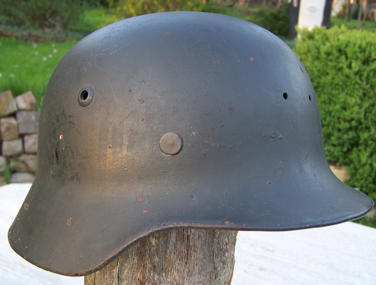 Dit is een Duitse helm die doorgebruikt is door de Tsjechen.Aan de gaatjes aan de voorzijde te zien is deze ooit bedoeld geweest voor de brandweer.
