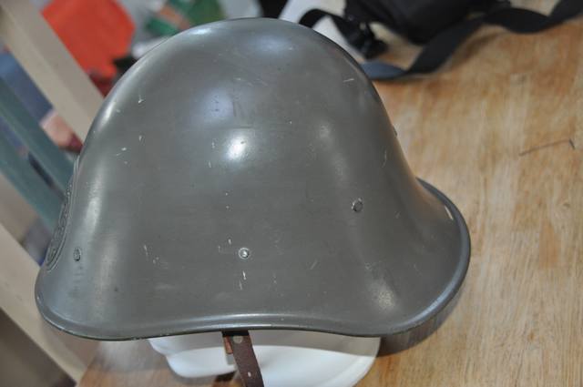 De helm in deze uitvoering heeft toebehoort aan de naoorlogse BB (Burger Bescherming). Het is zoals Zjopske al vermeld, de stalen buitenpot is begin jaren vijftig overgespoten in de grijsgroene kleur van de BB. Omdat het om een oude voorraad ging zonder binnenhelm heeft men er een roodbruin lederen binnenhelm ingezet. Dit was een standaard verstrekking en niet bedoelt voor officieren o.i.d.