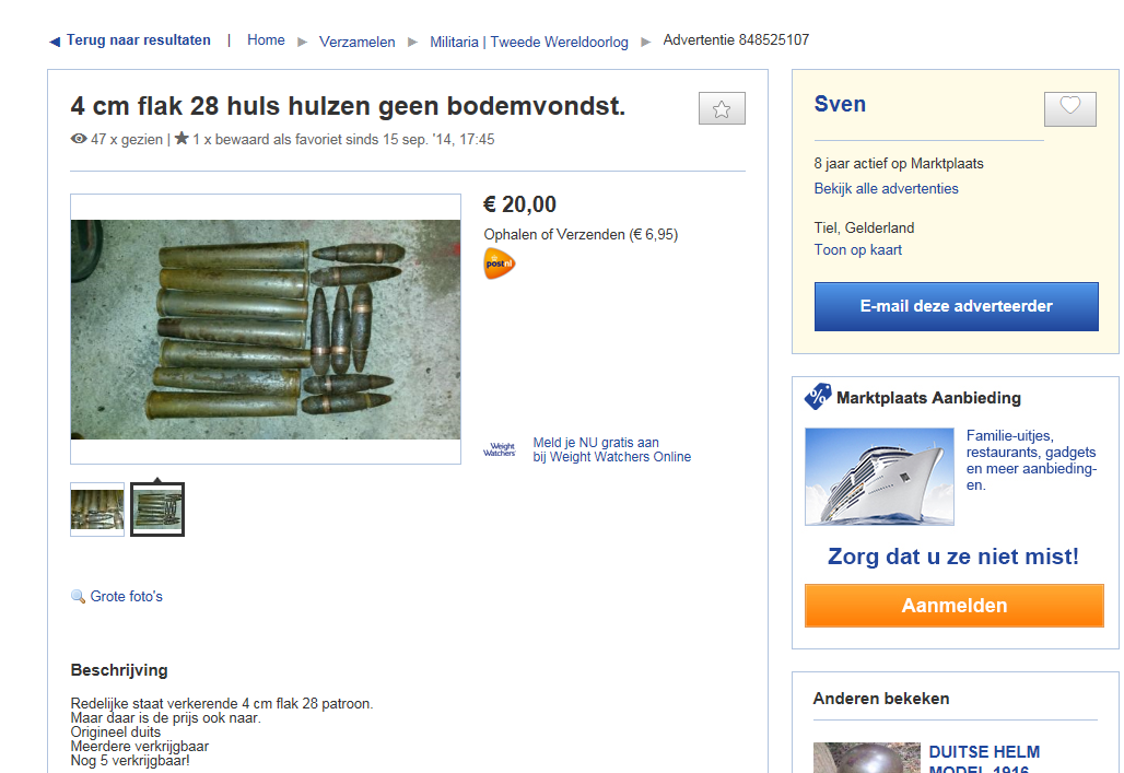 Gun Collector schreef:Ik heb die man meerdere keren gewaarschuwd voor het aanbieden van illegale objecten maar hoor er nooit iets van. Hij bied vaak mp40 en zulk soort dingen aan. En het gekke is MP verwijderd de advertenties niet.