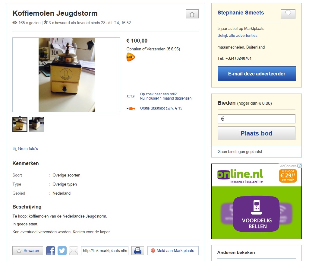 Te koop: koffiemolen van de Nederlandse Jeugdstorm.