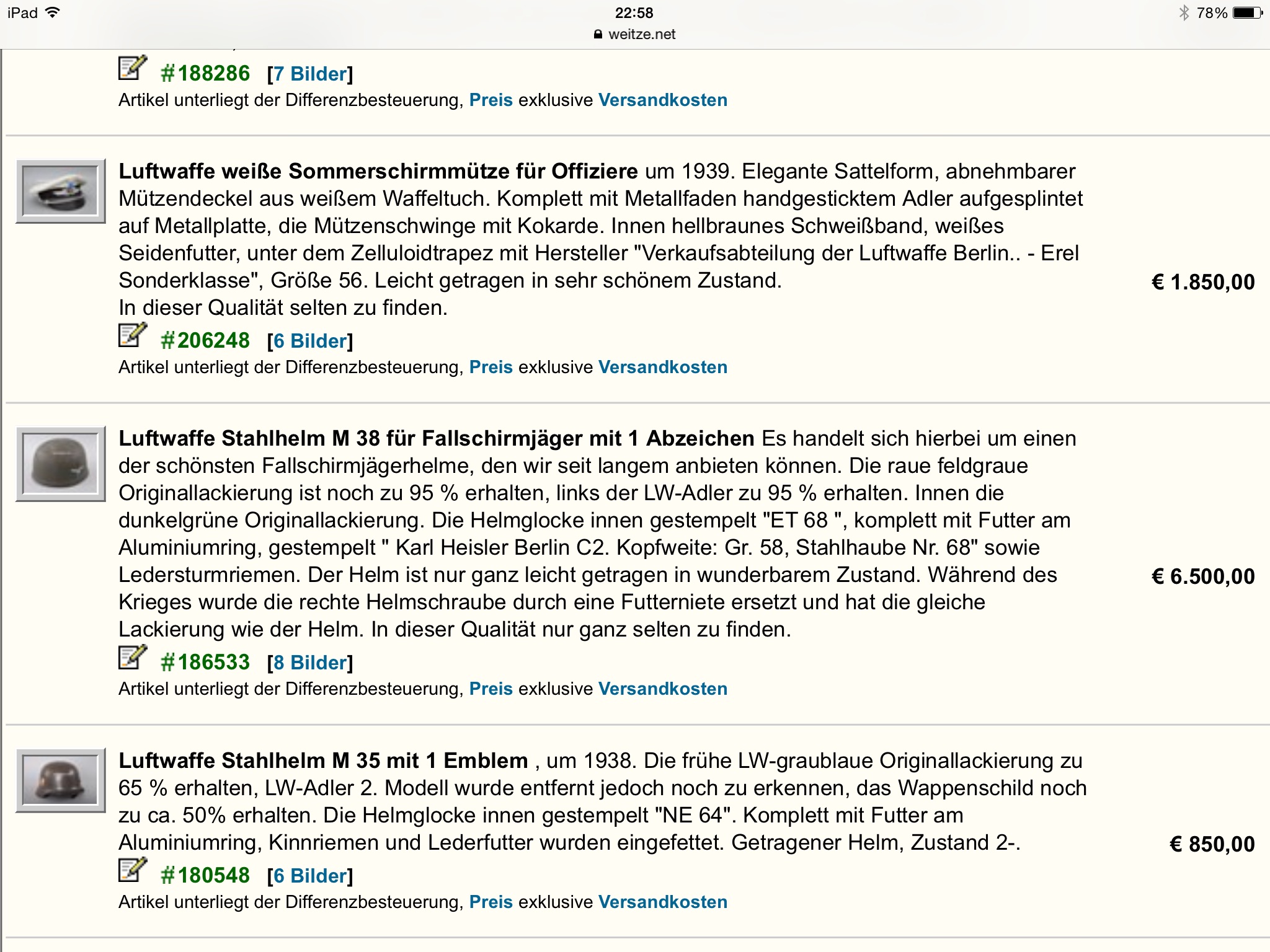 Nog een hele leuke bijeenkomstigheid, de FJ helm staat al weer een week te koop en de centen blijven achterwege. Goeie reklame voor Weitze. Ik heb ook nog een keer de advertentie nagelezen en geen woord over de bijgewerkte adelaar dus van onwetendheid van hun kant is geen sprake. Ik heb de helm te snel en te enthausiast gekocht maar als je naar de foto,s kijkt zijn die zo genomen dat je de bijgewerkte stukken niet kan ontdekken. De aannemenlijkheid van de helm en de bijgaande tekst waren gewoon top. Mooie les altijd extra foto,s vragen in hoge resolutie dat bieden ze namelijk zelf aan.